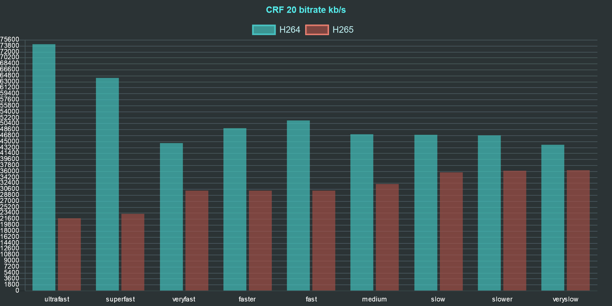 This comprehensive FFmpeg encoding comparison includes H.264 and H.265 HEVC from the fastest preset ultrafast through to veryslow with CRF values from 20 to 30.